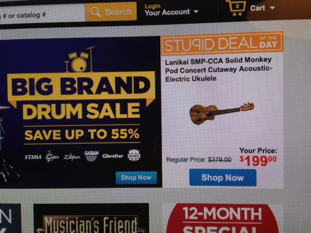 A second appropriate example for our discussion is Musician’s Friend, an online music gear seller. This week, I received an email from the company about a great deal on a particular Lanikai acoustic-electric ukelele (while supplies last!) – push marketing! The email, of course, pushed me to the Musician’s Friend website which has A LOT of options on the front page, but there up top was the Lanikai uke.