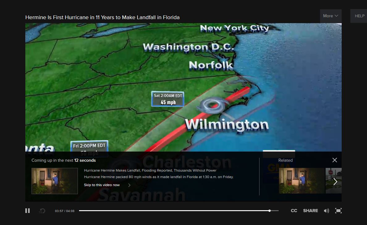 Sadly, the rest of my experience of browsing through ABC’s recent video archive was not as rewarding. Even if the content was of interest (assorted Donald Trump shenanigans, a story on California wine growers, etc.), my level of satisfaction was diminished by not only pre-roll ads – which we have come to expect these days (on the ABC site, every video had a pre-roll of :30 or :15 which could not be skipped at any point) – but also by large tease banners for the next video in the cue coming up with :20 remaining. I was an annoyed user.