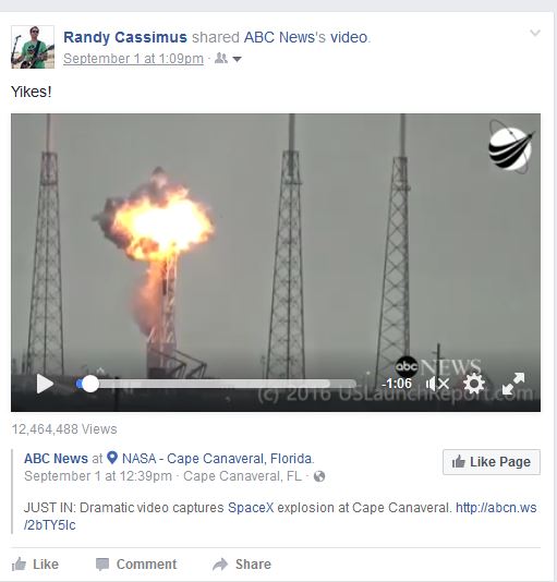 The ABC News social team produced a gold standard social share. I was merely scrolling up with no plans to stop, but the auto-play video started when it hit the middle of my iPhone screen and it did not make me wait for any “payoff.” Only three seconds into the video clip, a spectacular fireball from atop the rocket jumped right out toward me! Instant engagement from the stunning visual – which I played back repeatedly – soon lead to reading the full post about how the explosion had just happened a few minutes earlier and that the rocket had been carrying a payload of a $95-million satellite commissioned by Facebook to enhance service to the African continent. I shared it on my own feed, and several friends re-shared from me – a perfect example of a successful social post by ABC News.